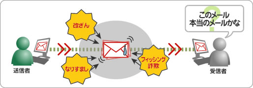 電子メールの通信は、郵便に例えるとハガキに似ています。ハガキは、相手に届くまでに、いくつもの経路をたどり、その間、誰でも盗み見ることが可能で、改ざんされる危険にさらされています。同様に、電子メールも配達されるまでに、インターネット上でいくつものコンピューターを経由して相手に運ばれていきます。そして、この経路には最近問題になっている改ざんやなりすまし、フィッシング詐欺などの危険が潜んでいます。