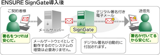 『ENSURE SignGate』は、そういった電子メールに対する企業の不安を解消する為に開発された、デジタル署名付加サービスです。