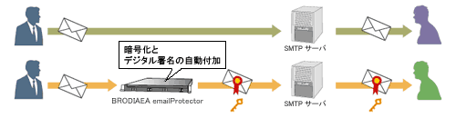 BRODIAEA emailProtector Standard Editionは、送信する電子メールの暗号化とデジタル署名の追加を自動的に行うゲートウェイサーバです。